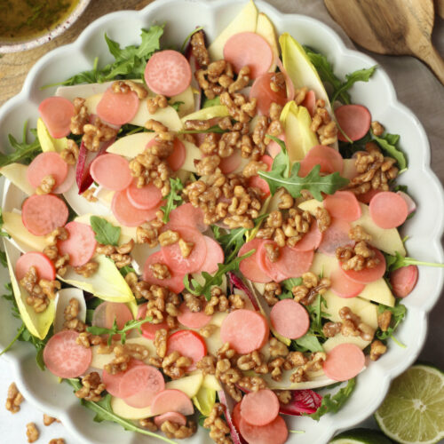 - Assemble the salad. To a large bowl, add a bed of endive and arugula leaves. Next, add the remaining toppings, including the pickled radishes, thinly sliced apple chunks, and candied walnuts. Drizzle enough dressing to suit your taste buds and serve immediately.