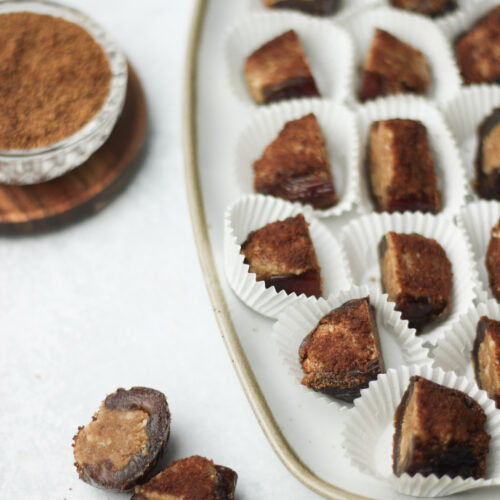 - Press the tops of each date into the cinnamon sugar mixture. Place the dates into the fridge for at least two hours and then cut them into half.