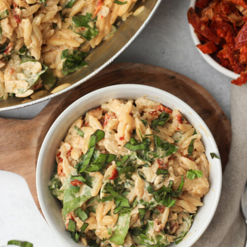 Store any leftover creamy vegan garlic orzo in an airtight container in the fridge for up to 3–4 days. As it sits, the sauce will thicken, so when reheating, add a splash of plant milk or water to bring back its creamy texture.