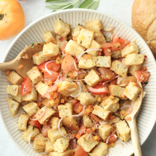 Traditional panzanella is an Italian bread salad made with toasted bread, fresh tomatoes, basil, and a simple vinaigrette. This fall version adds sauteed fall vegetables, sourdough bread, and a maple apple cider vinaigrette for a cozy, seasonal twist.