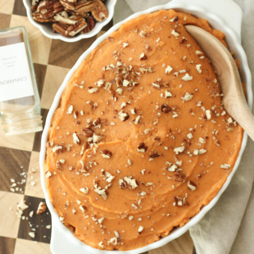 To reheat vegan mashed sweet potatoes, transfer them to a casserole dish, stir in a splash of coconut milk and cover tightly with foil. Place in a 350ยฐF oven for about 20 to 30 minutes, stirring once halfway through and adding more liquid if needed. This keeps the sweet potatoes creamy and makes it easy to prep them ahead and warm the whole dish right before serving.