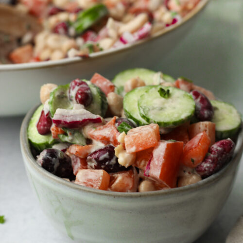 Feel free to adjust the bean combination based on what you enjoy most. If there are certain beans you prefer, simply double them and leave out the ones you do not want. Just keep in mind that pinto and black beans do not work as well in this Mediterranean-style salad.