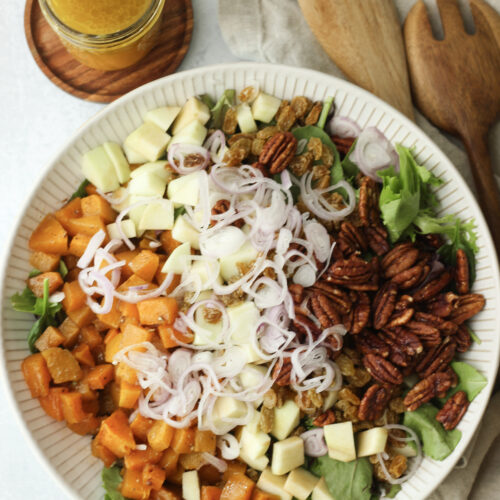 Pumpkin Maple Vinaigrette: Use my recipe that you can find here. It’s absolutely delish! The ingredients are olive oil, apple cider vinegar, pumpkin puree, maple syrup, Dijon mustard, garlic, and salt.
