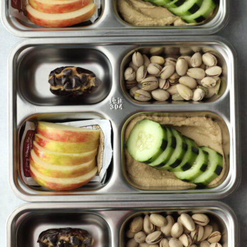 Hummus: Pick up your favorite store-bought hummus for an easy, protein-rich dip. It pairs perfectly with the fresh veggies in these vegan bento snack boxes.