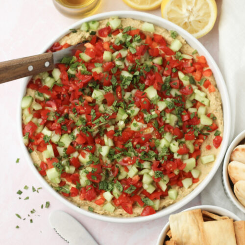 This dip pairs well with fresh vegetables, pita chips, crackers, flatbread, or pita bread.