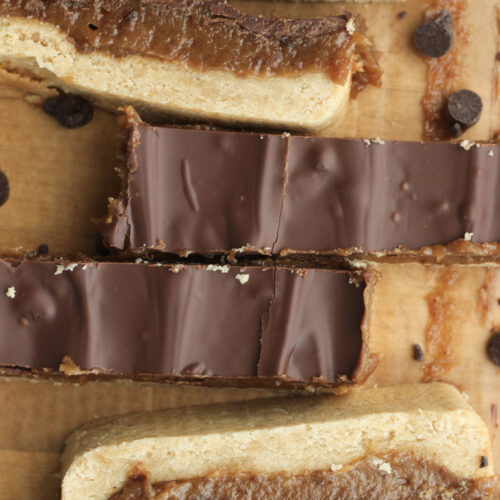 They are a healthier twist on a classic Twix bar with a soft cookie base, gooey caramel layer, and chocolate topping, but made with wholesome ingredients. I would say they aren’t the same flavor, but I like my version better!