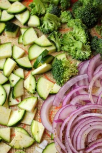 - Place the chopped vegetables onto the lined baking sheet. Drizzle with avocado oil, and sprinkle with salt and pepper. Using your hands, toss until all of the vegetables are evenly coated. Spread the vegetables into a single, even layer. Cook for 15-20 minutes or until the edges are browned.