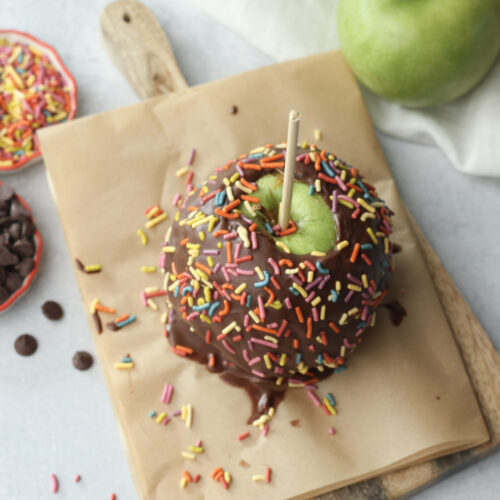 Toppings: Finish with fun toppings to customize your apple. Try dye free sprinkles for a festive look, or crushed peanuts, sea salt, or shredded coconut for extra flavor and crunch.
